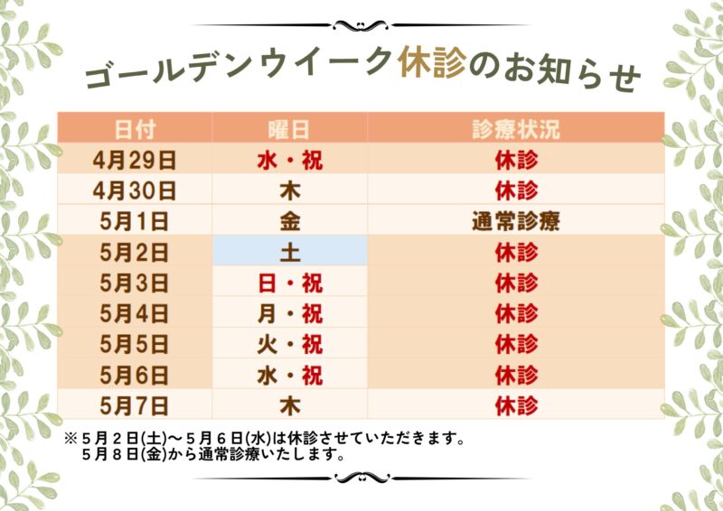 ゴールデンウィークは5月2日~5月6日まで休診となります。